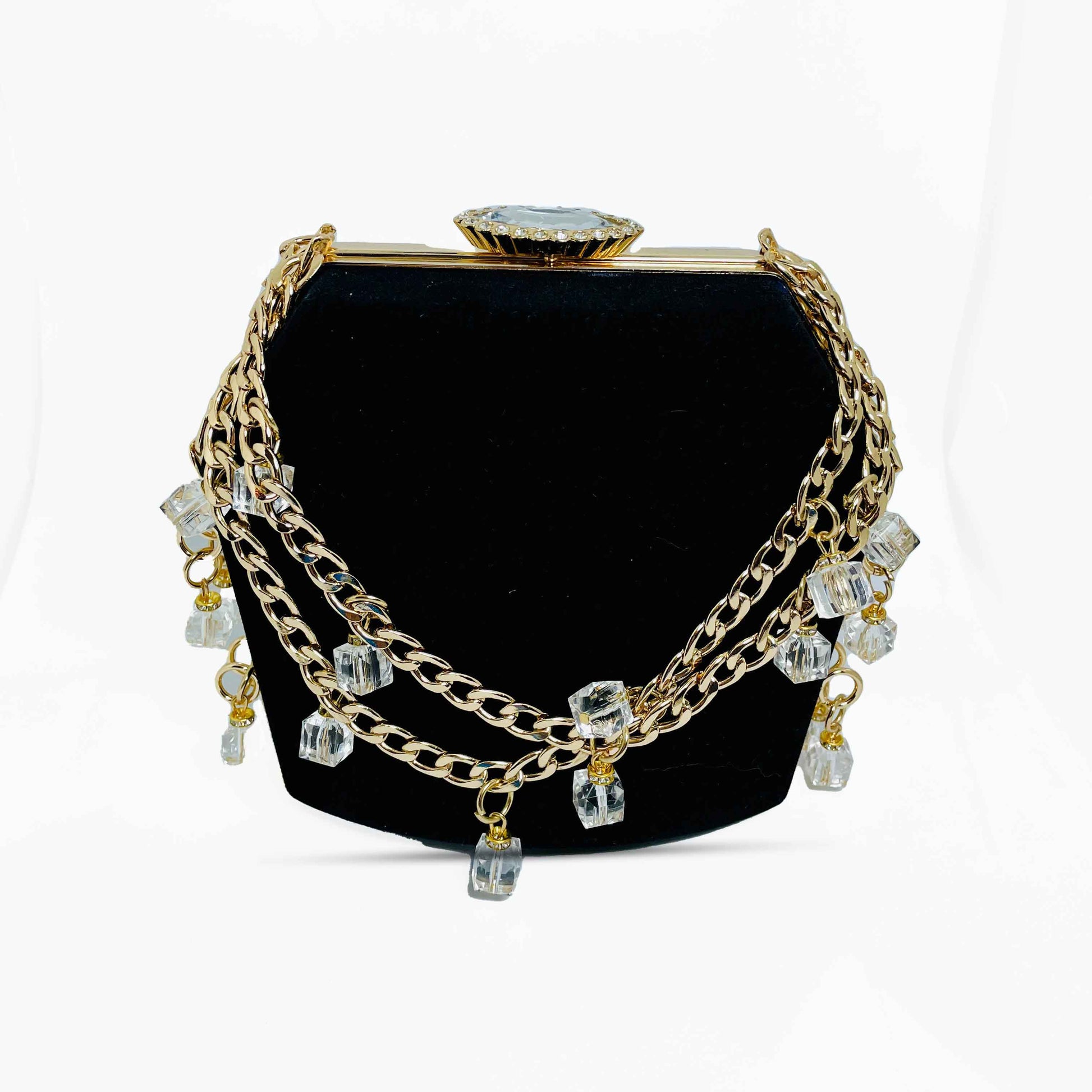 A bold statement piece with a striking five-sided design complete with a sleek chain handle, it’s your go-to for an elegant evening look.